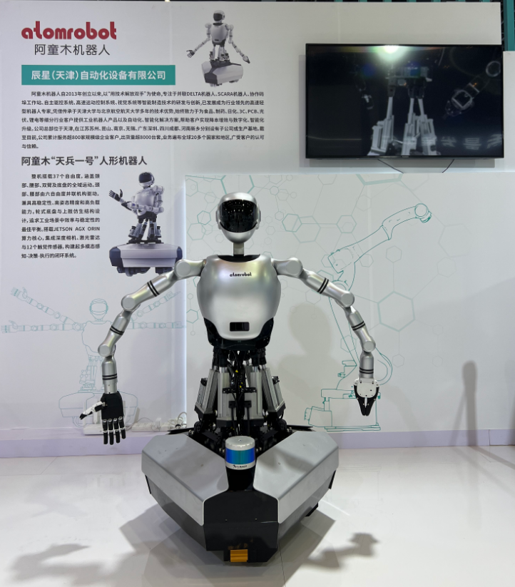 天津作为共同主办单位,组织了100多家企业参展参会。阿童木机器人携“天兵一号”人形机器人亮相。