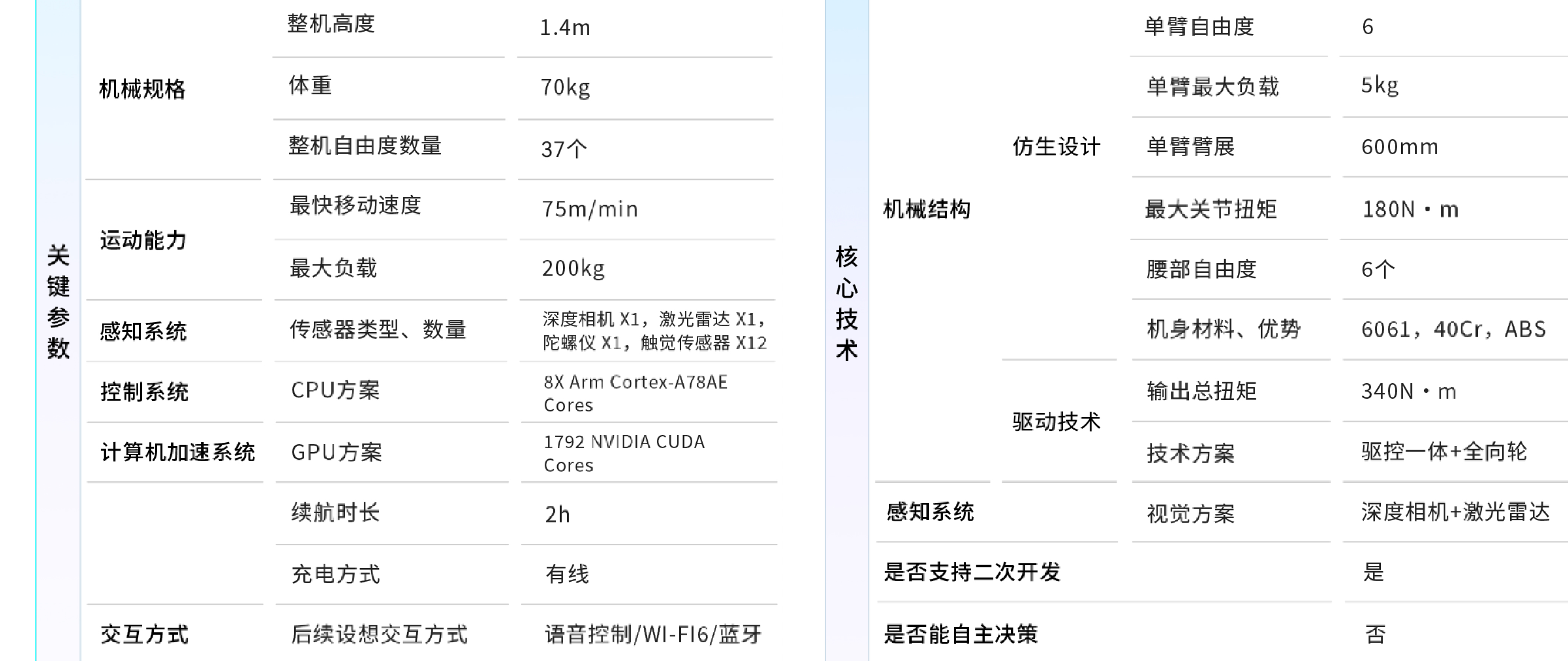全身搭载37个自由度仿生架构;8颗Arm Cortex-A78AE + 1792 个 CUDA 组成实时决策系统 深度相机、激光雷达与12个触觉传感器构建三维感知网络。