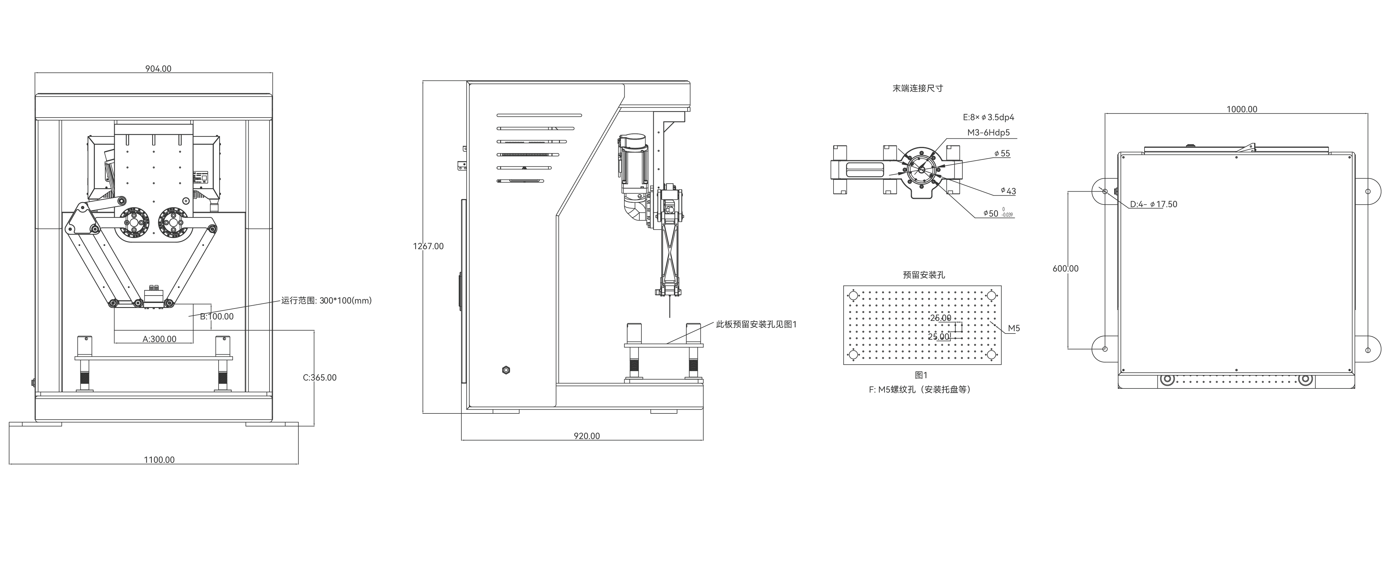 3、可拓展动平台设计 可拓展动平台设计,可以根据不同的应用场景安装多元化的末端,支持增加旋转轴、俯仰轴、真空吸盘、气缸夹爪、电夹爪等;