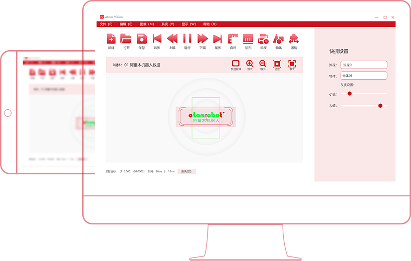 针对用户习惯、开发灰度、物体流程的快捷操作界面。同时提供相机夹角、计算像素比、9点示教,多客户端/服务器支持等方面用户操作的功能。